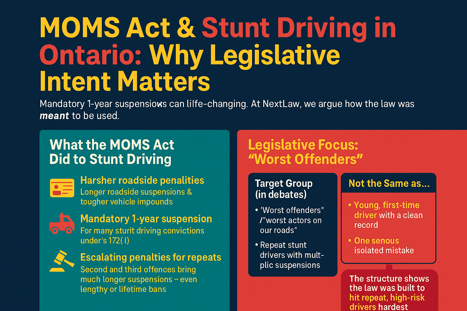 For drivers facing stunt driving allegations in Ontario, having a legal representative who understands not only the wording of the MOMS Act but its underlying justification and spirit can make a critical difference. At NextLaw, that is the foundation of how stunt driving submissions are prepared and presented, case after case, across the province.